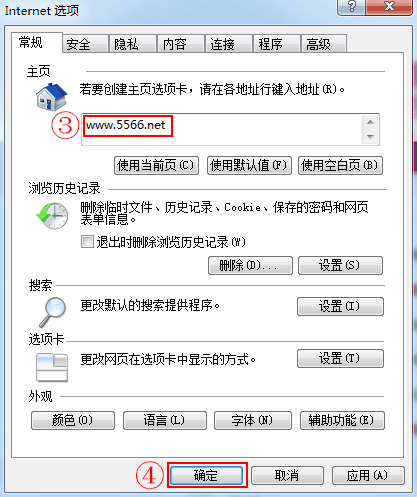 3.在“常规”的主页处,删除原有的网址,输入:www.5566.net或www.5566.org